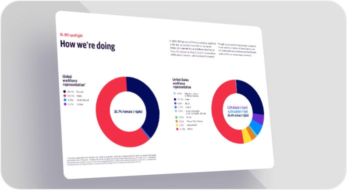 DEI spotlight In 2020, 38.7 percent of Twilio’s workforce identified Though we are performing strongly compared as female, up 6 points from 2019. In the United to our industry in terms of these metrics, we States, 26.4 percent of our workforce identified as will continue to use ourselves as a benchmark How we're doing Asian, 5.5 percent as Black (a 2 point increase from and monitor our own progress annually. 2019), and 6.5 percent LatinX (a 1 point increase). Global United States workforce workforce representation¹ representation 38.7% Female 0.3% American Indian 60.5% Male or Alaska Native 0.5% Undeclared 26.4% Asian 0.2% Other 5.5% Black 6.5% LatinX 5.5% Black (+2pts) 38.7% Female (+6pts) 0.7% Native Hawaiian 6.5% LatinX (+1pt) or Other Pacific Islander 26.4% Asian (-2pts) 0.8% Other 3.0% Two or More Races 5.3% Undeclared 51.4% White 1 This report uses the terms "female" and "male" to accurately reflect how Twilions self-identified in response to the existing data fields in our HR system. Though statistically accurate, we recognize that these terms are not inclusive of all individuals who identify as women or men, or who were assigned female or male at birth but do not identify as women or men. Moving forward, we are working on ways for our data and reporting to most accurately reflect our workforce.