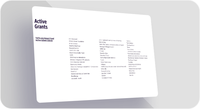 Active Grants Twilio.org Impact Fund 2-1-1 Maryland Johns Hopkins University School of Nursing Tarjimly Active Grants (2020) Africa's Voices Foundation MomsRising Tech Matters Atma Connect NAMI (The National Alliance on Mental Illness) The Steve Fund Benefits Data Trust Norwegian Refugee Council Thorn Beyond Conflict notOk App Trans Lifeline Black Girls Code NPower Translators without Borders Black Voters Matter Fund Objective Zero Trek Medics International CARE Operation Fistula The National Center for Victims of Crime Child Helpline International Partnership to End Addiction The National Domestic Workers Alliance Children's Hospital of Philadelphia Polaris The Trevor Project Crisis Response Network Protect Democracy Turn2Me Democracy Works rAINbow United Ways of California Education, Training & Research (ETR) Associates RAINN (Rape, Abuse & Incest National Network) USA for UNHCR Fast Forward REFUNITE Vibrant Emotional Health Good Call Rescue America Woke Vote International Rescue Committee Save the Children WeRobotics ISeeChange SMASH Year Up Jacaranda Health St. James Infirmary