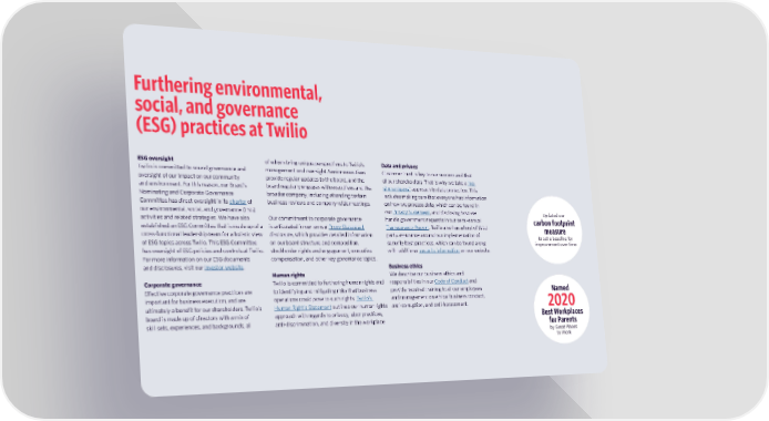 Furthering environmental, social, and governance (ESG) practices at Twilio ESG oversight of whom bring unique perspectives to Twilio’s Data and privacy Twilio is committed to sound governance and management and oversight. Senior executives Customer trust is key to our success and that oversight of our impact on our community provide regular updates to the board, and the of our shareholders. That is why we take a “no and environment. For this reason, our Board’s board regularly engages with executives and the shenanigans” approach to data protection. This Nominating and Corporate Governance broader company, including attending certain includes making sure that everyone has information Committee has direct oversight in its charter of business reviews and company-wide meetings. on how we process data, which can be found in our environmental, social, and governance (ESG) our Privacy Statement, and disclosing how we Updated our activities and related strategies. We have also Our commitment to corporate governance handle government requests in our semi-annual carbon footprint established an ESG Committee that is made up of a is articulated in our annual Proxy Statement Transparency Report. Twilio also has a host of third- measure cross-functional leadership team for a holistic view disclosure, which provides detailed information party assurance around our implementation of to set a baseline for of ESG topics across Twilio. This ESG Committee on our board structure and composition, security best practices, which can be found along improvement over time has oversight of ESG policies and controls at Twilio. stockholder rights and engagement, executive with additional security information on our website. For more information on our ESG documents compensation, and other key governance topics. and disclosures, visit our investor website. Business ethics Human rights We describe our business ethics and Corporate governance Twilio is committed to furthering human rights and responsibilities in our Code of Conduct and Effective corporate governance practices are to identifying and mitigating risks that business provide required training to all our employees Named important for business execution, and are operations could pose to such rights. Twilio’s and management on ethical business conduct, ultimately a benefit for our shareholders. Twilio’s Human Right’s Statement outlines our human rights anti-corruption, and anti-harassment. 2020 board is made up of directors with a mix of approach with regards to privacy, labor practices, Best Workplaces skill sets, experiences, and backgrounds, all anti-discrimination, and diversity in the workplace. for Parents by Great Places to Work