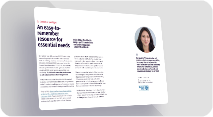 Customer spotlight An easy-to- remember resource for United Way Worldwide ramps up 211 capabilities essential needs and technology amid COVID-19 outbreak In a typical year, 211 receives 35,000 calls a day, platform, where the AI-assisted IVR bot built on Our goal isn’t to reduce the call connecting people to essential social services Twilio Autopilot and Twilio Flex could answer volume—it’s to increase our ability such as housing, financial assistance, food access, commonly asked questions about COVID-19. If to answer the call volume. We childcare, transportation, and more. But in the the caller still wanted to speak to a specialist, want to be able to talk to everyone immediate aftermath of COVID-19, the network they would be routed to a live agent or back to who wants to talk to us, and we (made up of more than 200 agencies and their a local 211 with available specialists to answer. need centralized, efficient, and roughly 2,000 social service specialists) was seamless technology to do that.” receiving 75,000 calls every day, an increase The system was first tested in Ohio to provide in call volume of more than 100 percent. call coverage to every county. With the entire state now covered by a connected 211 system, The 211 team at United Way Worldwide wanted 211 agencies are now in talks with state RACHEL KRAUSMAN to better connect the decentralized 211 systems to government to activate and receive funding to — SR, DIRECTOR OF 211, make it easier to load balance call volumes, engage build capacity even further, which wouldn’t have UNITED WAY WORLDWIDE volunteers, and more efficiently share information. been possible before the new technology. They quickly developed a streamlined routing For the United Way team, this is all part of their system with a front-end interactive voice desire to find any possible way to help, whether response (IVR). People could call in to a single in their already-heroic regular course of business 1-800 number or their local 211, which would or during extraordinary times such as these. automatically transfer some calls to the new