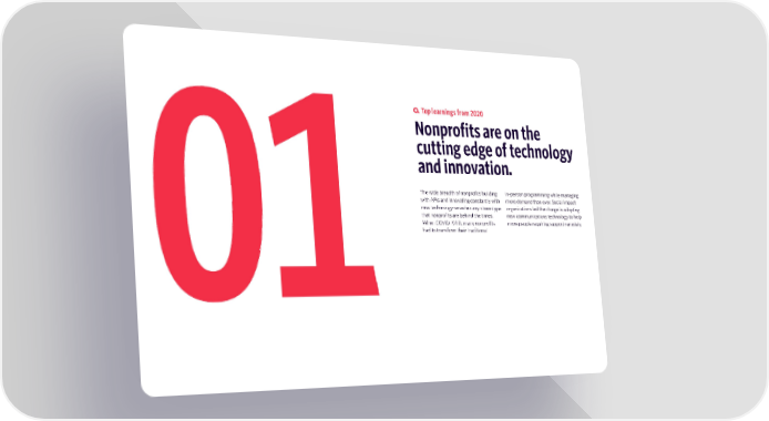 Top learnings from 2020 Nonprofits are on the cutting edge of technology and innovation. The wide breadth of nonprofits building in-person programming while managing with APIs and innovating constantly with more demand than ever. Social impact new technology smashes any stereotype organizations led the charge in adopting that nonprofits are behind the times. new communications technology to help When COVID-19 hit, many nonprofits more people requiring support remotely. 01 had to transform their traditional