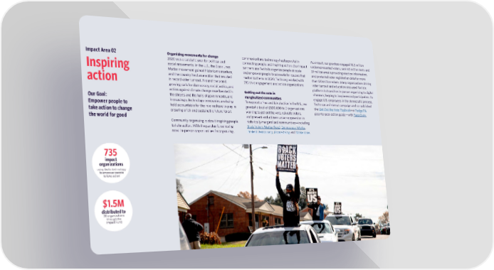 Impact Area 02 Organizing movements for change communications technology has been vital in As a result, our grantees engaged 10.5 million 2020 was a catalytic year for political and connecting people and inspiring action. Our impact underrepresented voters, sent 65 million texts and social movements. In the U.S., the Black Lives partners use Twilio to organize people at scale 37 million emails providing election information, Inspiring Matter movement gained historic momentum, and empower people to advocate for causes that and protected voter registration data for more and the country held an election that resulted matter to them. In 2020, Twilio.org worked with than 120 million voters. Many organizations driving action in record voter turnout. Around the world, 735 civic engagement and action organizations voter turnout and education also used Twilio’s growing calls for democracy, racial justice, and platform to transition in-person organizing to digital action against climate change reverberated in Getting out the vote in channels, helping to inspire record participation. To Our Goal: the streets and the halls of governments, and marginalized communities engage U.S. employees in the democratic process, Empower people to increasingly, technology companies are being To support a free and fair election in the U.S., we Twilio ran an internal campaign and co-published held accountable for the role we have to play in granted a total of $500,000 to 5 organizations the Get Out the Vote Playbook—a Pledge 1% take action to change ensuring a fair and sustainable future for all. working to get out the vote, educate voters, peer-to-peer action guide—with PagerDuty. the world for good and prevent and address voter suppression in Community organizing is about inspiring people historically marginalized communities—including to take action. With the pandemic removing Black Voters Matter Fund, Democracy Works, most in-person opportunities for organizing, Protect Democracy, MomsRising and Woke Vote. 735 impact organizations using Twilio technology to empower people to take action $1.5M distributed to 20 organizations through the Impact Fund