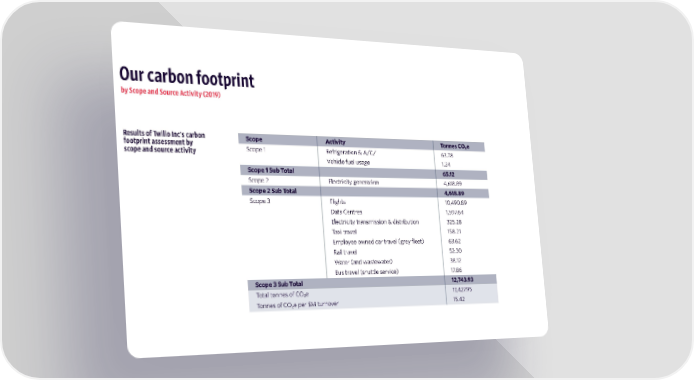 Our carbon footprint by Scope and Source Activity (2019) Results of Twilio Inc's carbon Scope Activity Tonnes CO₂e footprint assessment by Scope 1 Refrigeration & A/C/ 63.78 scope and source activity Vehicle fuel usage 1.24 Scope 1 Sub Total 65.12 Scope 2 Electricity generation 4,618.89 Scope 2 Sub Total 4,618.89 Scope 3 Flights 10,490.89 Data Centres 1,597.64 Electricity transmission & distribution 325.28 Taxi travel 158.21 Employee owned car travel (grey fleet) 63.62 Rail travel 52.30 Water (and wastewater) 38.12 Bus travel (shuttle service) 17.86 Scope 3 Sub Total 12,743.93 Total tonnes of CO₂e 17,427.95 Tonnes of CO₂e per $M turnover 15.42