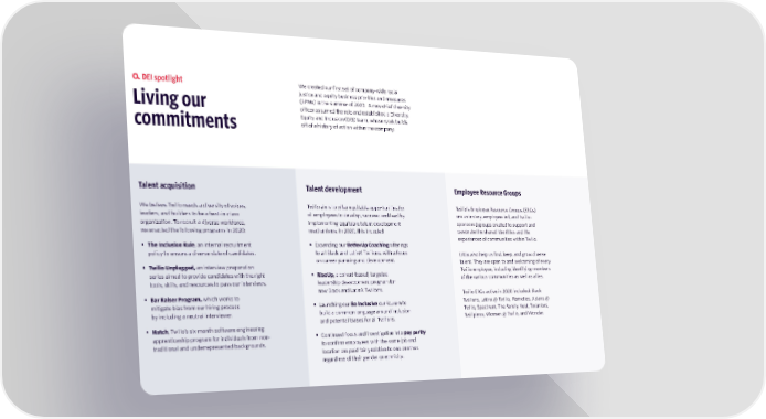 DEI spotlight We created our first set of company-wide racial justice and equity business priorities and measures (BPMs) in the summer of 2020. A new chief diversity Living our officer assumed the role and established a Diversity, Equity and Inclusion (DEI) team, whose work builds commitments off of a history of action within the company. Talent acquisition Talent development Employee Resource Groups We believe Twilio needs a diversity of voices, Twilio aims to offer equitable opportunities for Twilio’s Employee Resource Groups (ERGs) leaders, and builders to be a best-in-class all employees to develop, succeed and lead by are voluntary, employee-led, and Twilio- organization. To recruit a diverse workforce, implementing equitable talent development sponsored groups created to support and we enacted the following programs in 2020: mechanisms. In 2020, this included: celebrate the shared identities and life • The Inclusion Rule, an internal recruitment • Expanding our BetterUp Coaching offerings experiences of communities within Twilio. policy to ensure a diverse slate of candidates. to all Black and LatinX Twilions, with a focus ERGs also help us find, keep, and grow diverse • Twilio Unplugged, an interview preparation on career planning and development. talent. They are open to and welcoming of every series aimed to provide candidates with the right • RiseUp, a cohort-based, targeted Twilio employee, including identifying members tools, skills, and resources to pass our interviews. leadership development program for of the various communities as well as allies. • Bar Raiser Program, which works to new Black and LatinX Twilions. Twilio ERGs active in 2020 included: Black mitigate bias from our hiring process • Launching our Be Inclusive curriculum to Twilions, Latinx @ Twilio, Remoties, Asians @ by including a neutral interviewer. build a common language around inclusion Twilio, Spectrum, The Family Nest, Twarriors, and potential biases for all Twilions. Twilipinos, Women @ Twilio, and Wonder. • Hatch, Twilio’s six month software engineering apprenticeship program for individuals from non- • Continued focus and investigation into pay parity traditional and underrepresented backgrounds. to confirm employees with the same job and location are paid fairly relative to one another, regardless of their gender or ethnicity.