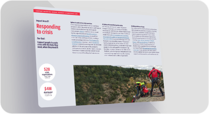 CONTENT WARNING: SEXUAL ASSAULT & SUBSTANCE USE Impact Area 01 Spikes in calls in for crisis services A history of committed partnership Building hotlines of hope Crisis response organizations saw extraordinary At Twilio.org, we focus on supporting people Our impact partners, both customers and grantees, demand in 2020. Stay-at-home orders and financial through acute crises such as natural disasters, demonstrated extraordinary innovation in building Responding distress exacerbated existing challenges for sexual abuse, substance use, refugee displacement, easy-to-use, confidential, scalable helplines to many people. RAINN, a national sexual assault mental health emergencies, and more. In 2019, we support people facing personal crises in 2020. to crisis hotline, reported a record 60,000 survivors established our Crisis Response and Prevention Twilio worked with 528 customer organizations of sexual assault and violence accessed their Initiative (CRPI) and Crisis Response Technology during the year focused on crisis response work, crisis line in May and June of 2020, including a Network (CRTN) to provide technology and share including Trans Lifeline, Norweigan Refugee Our Goal: record percentage of minors. The Partnership best practices across the industry. The group of Council, and Save the Children. In addition to Connect people in acute to End Addiction reported a nearly 50 percent leading organizations in their respective issue donations for COVID-19 rapid response and crisis with the help they increase in connections to help families overcome areas collaborates on how to innovate to help more disaster relief, we granted $2.9 million through need, when they need it addiction in the early days of the pandemic. people in crisis and leads Twilio in determining our Impact Fund to 20 organizations operating 2020 was also a record year for natural disasters, how best to support the sector. With the CRTN’s crisis lines to help people access legal support, from fires in Australia and the western United feedback, we’ve built product templates and code culturally appropriate medical care, domestic abuse States to a record-breaking hurricane season. samples to help organizations quickly stand up support, suicide prevention, and resettlement aid. crisis hotlines based on their unique needs. 528 crisis organizations using Twilio products $4M distributed through the Impact Fund 8