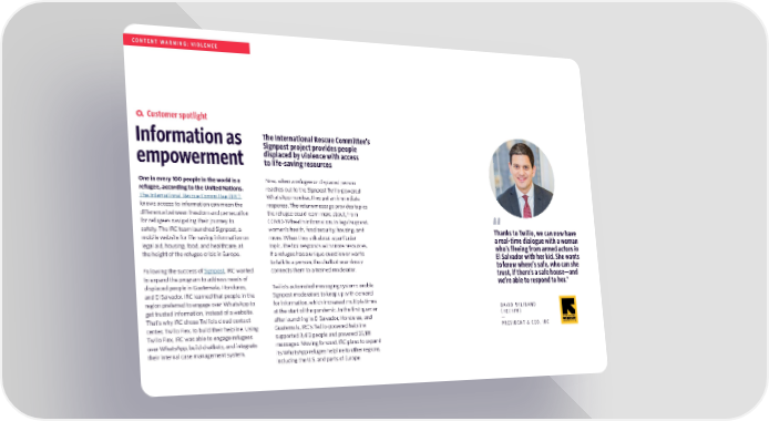 CONTENT WARNING: VIOLENCE Customer spotlight Information as The International Rescue Committee’s Signpost project provides people empowerment displaced by violence with access to life-saving resources One in every 100 people in the world is a Now, when a refugee or displaced person refugee, according to the United Nations. reaches out to the Signpost Twilio-powered The International Rescue Committee (IRC) WhatsApp number, they get an immediate knows access to information can mean the response. The return message provides topics difference between freedom and persecution the refugee could learn more about, from for refugees navigating their journey to COVID-19 health information, to legal support, safety. The IRC team launched Signpost, a women’s health, food security, housing, and Thanks to Twilio, we can now have mobile website for life-saving information on more. When they ask about a particular a real-time dialogue with a woman legal aid, housing, food, and healthcare, at topic, the bot responds with more resources. who’s fleeing from armed actors in the height of the refugee crisis in Europe. If a refugee has a unique question or wants El Salvador with her kid. She wants to talk to a person, the chatbot seamlessly to know where’s safe, who can she Following the success of Signpost, IRC wanted connects them to a trained moderator. trust, if there’s a safe house—and to expand the program to address needs of we’re able to respond to her." displaced people in Guatemala, Honduras, Twilio's automated messaging systems enable and El Salvador. IRC learned that people in the Signpost moderators to keep up with demand region preferred to engage over WhatsApp to for information, which increased multiple times get trusted information, instead of a website. at the start of the pandemic. In the first quarter DAVID MILIBAND That’s why IRC chose Twilio’s cloud contact after launching in El Salvador, Honduras, and (HE/HIM) center, Twilio Flex, to build their helpline. Using Guatemala, IRC's Twilio-powered helpline — PRESIDENT & CEO, IRC Twilio Flex, IRC was able to engage refugees supported 3,412 people and powered 25,181 over WhatsApp, build chatbots, and integrate messages. Moving forward, IRC plans to expand their internal case management system. its WhatsApp refugee helpline to other regions, including the U.S. and parts of Europe.